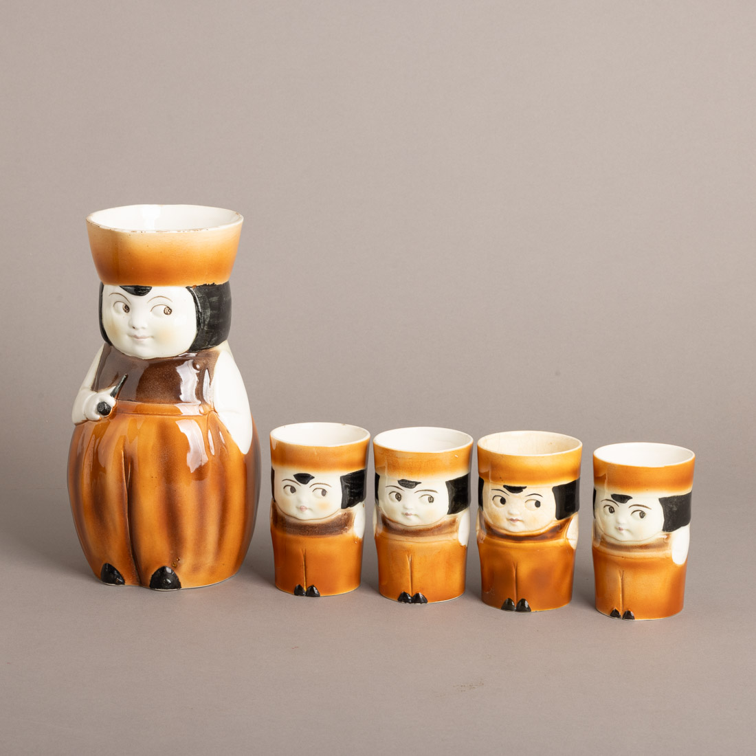 123. CONJUNTO DE JARRO E QUATRO COPOS "FIGURA A FUMAR CACHIMBO"