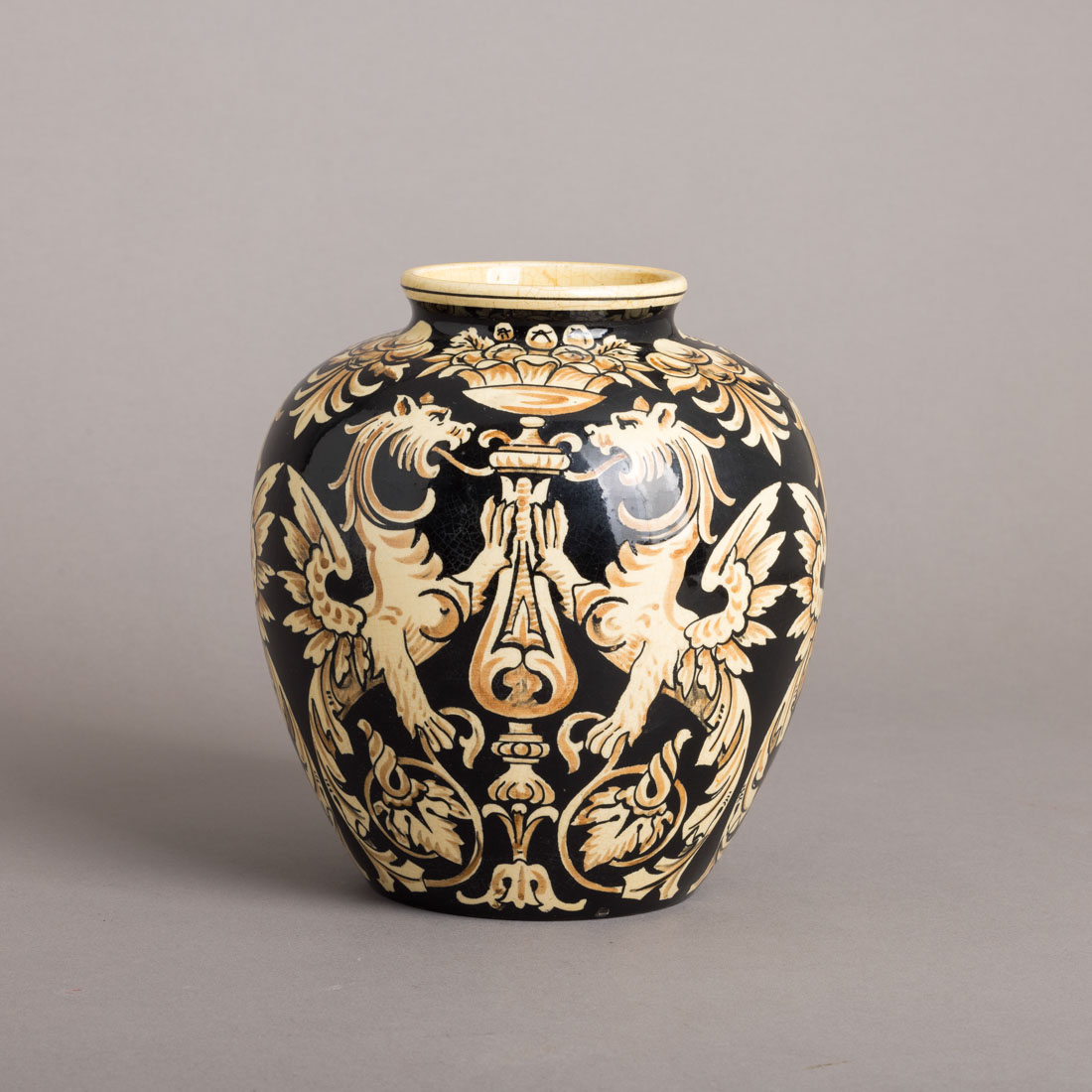 Em cerâmica vidrada fabrico Aleluia, Aveiro, decoração policromada "dragões". Marcada. Sinais de uso, craquelé.