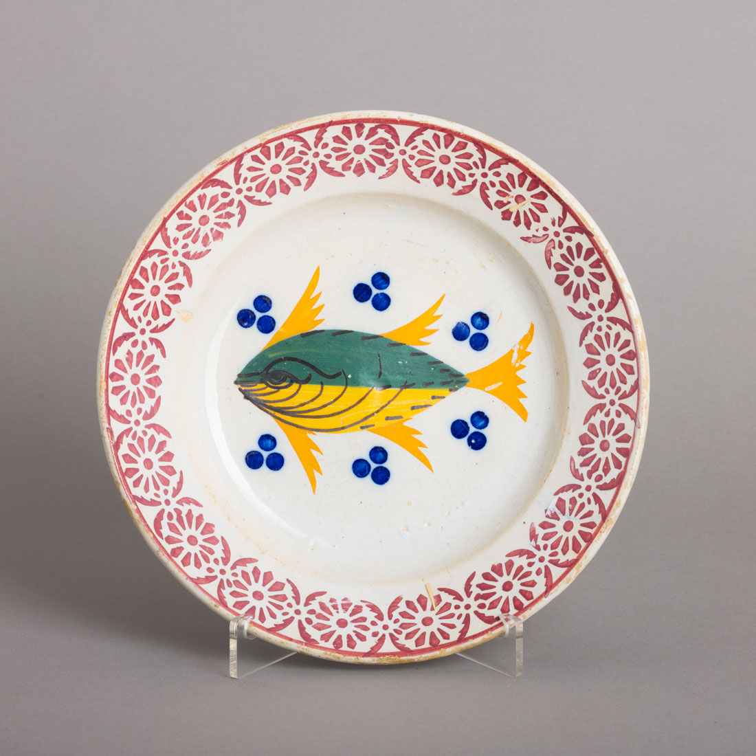 Em faiança portuguesa, decoração policromada "peixe". Séc. XIX/XX. Desgaste no vidrado, craquelé e pequeno cabelo.