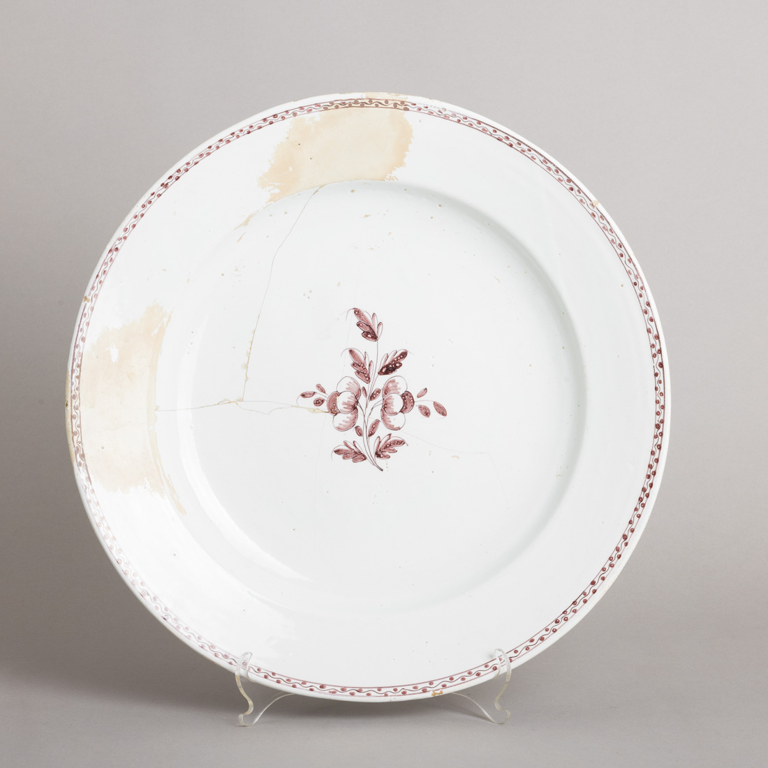 Em faiança portuguesa de Miragaia, Rocha Soares, decoração a vinoso "flores", no bordo friso de ponteados. Séc. XVIII/XIX. Marcado. Cabelos, esbeiçadela e restauros.
