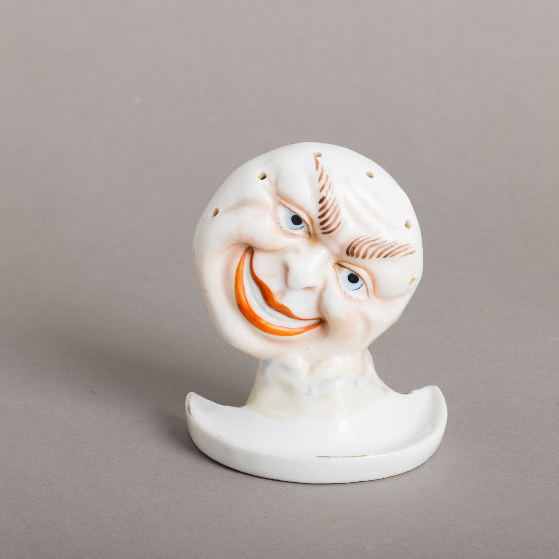 Em porcelana moldada e relevada (1924-1947), decoração policromada e dourada. Sinais de uso e ligeiro desgaste.