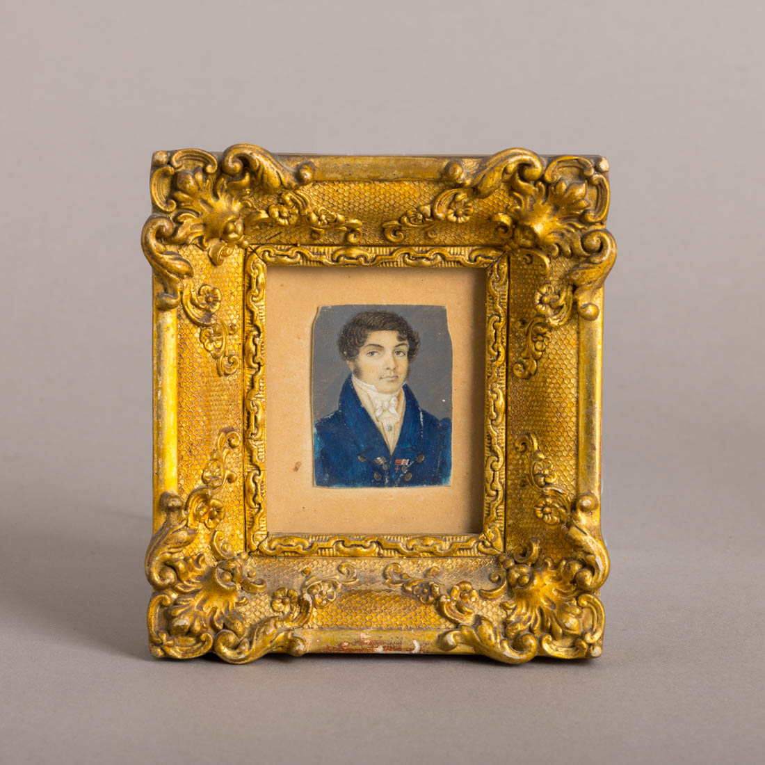 Pintura miniatura sobre placa, moldura em madeira e gesso entalhada e dourada. Pequenas falhas.