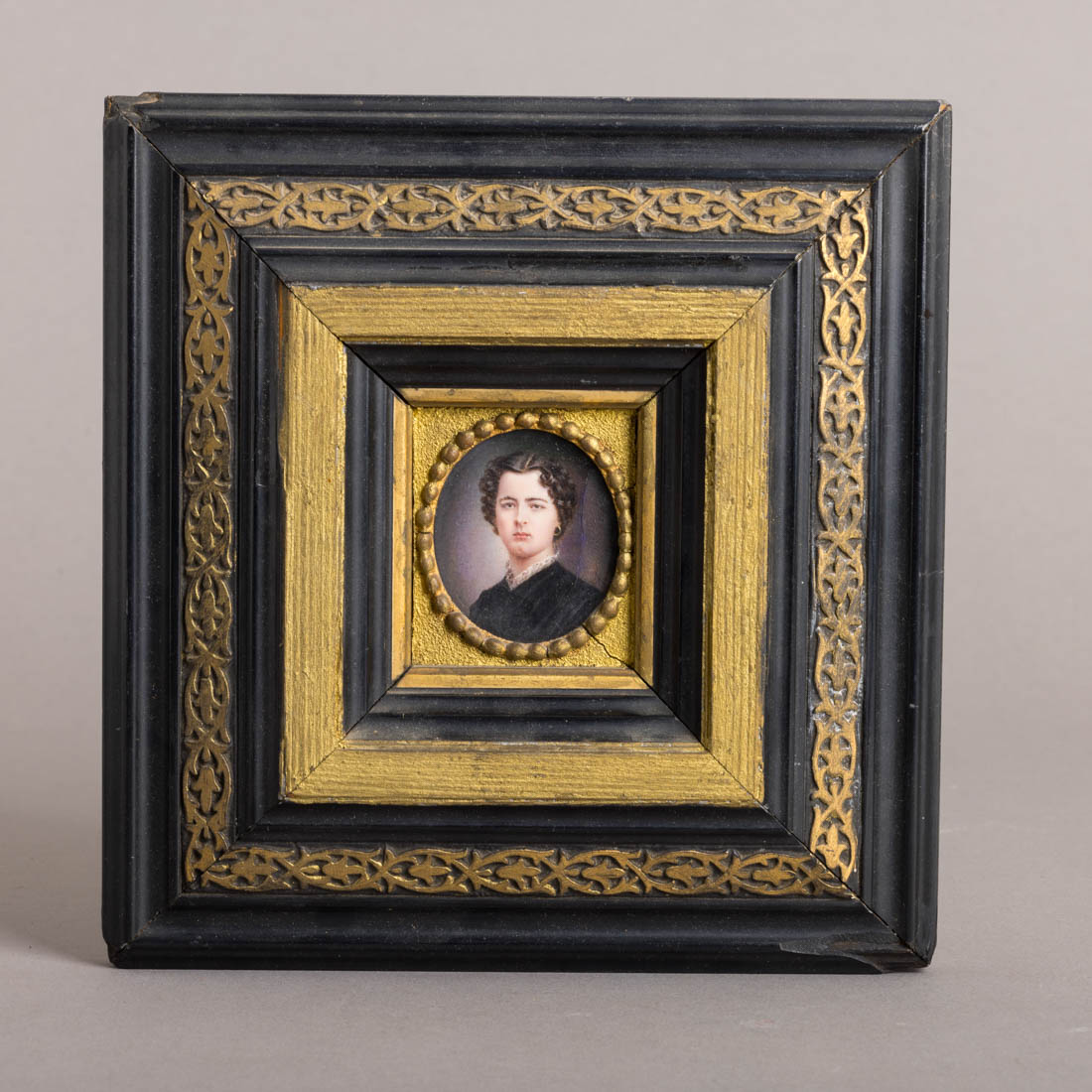 Pintura miniatura sobre placa, moldura em madeira pintada, entalhada e dourada. Defeito, moldura com falhas e defeitos.