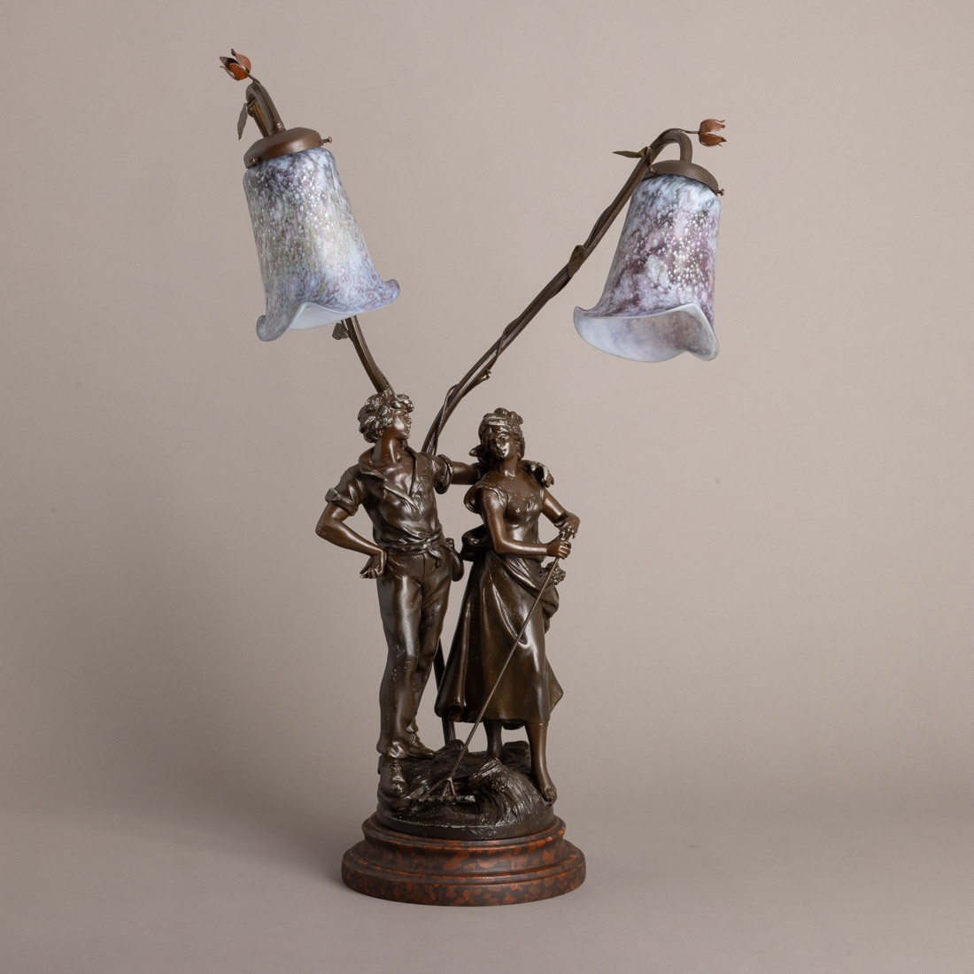Em bronze de arte relevado e patinado "Figuras", tulipas pasta de vidro, marcado L & F Moreau. Pequenas falhas e defeitos.