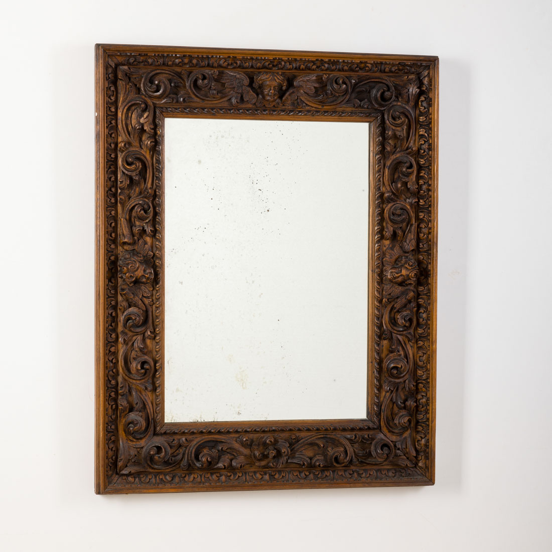 Molduras em castanho com entalhamentos "elementos vegetalistas e querubim". Sinais de uso.