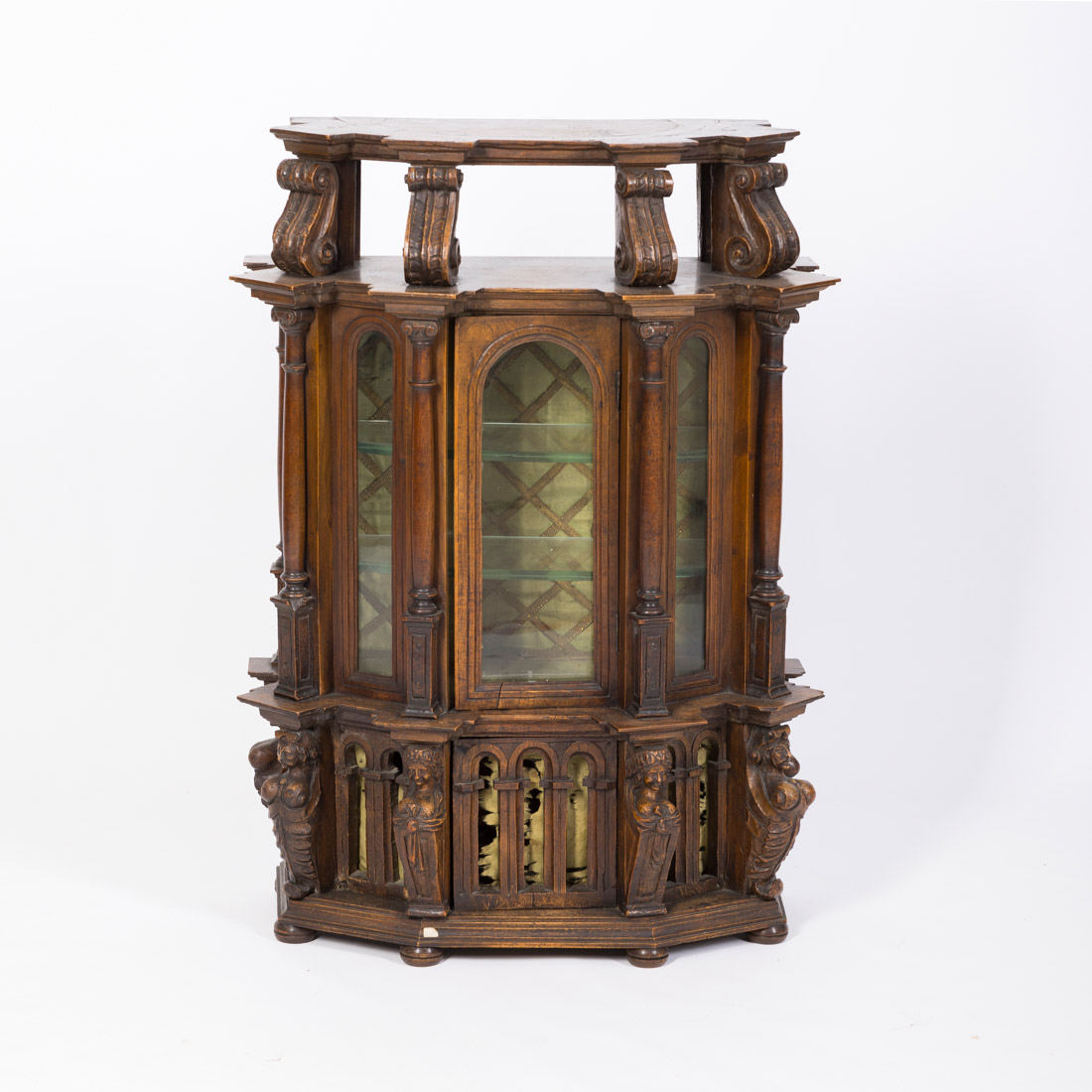 Em carvalho com entalhamentos, pequena porta e laterais em vidro, colunas torneadas, base suportada cariátides. Falhas, pequenos defeitos e vestígios de xilófagos.