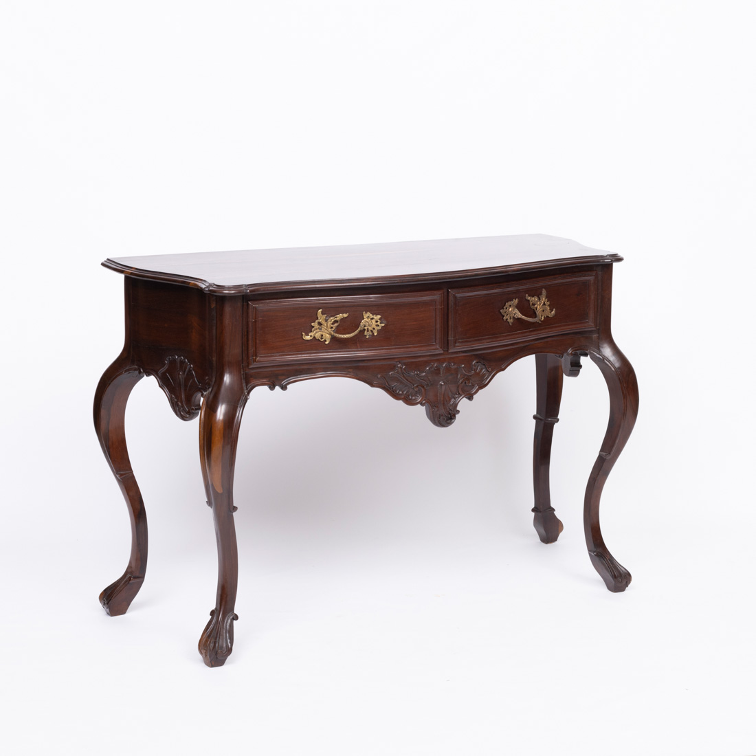 Estilo D. José, em pau santo com entalhamentos, tampo ondulado e recortado, de duas gavetas. Pequenos defeitos.