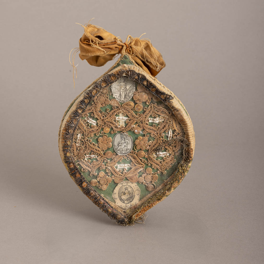Impressões a negro sobre papel, contendo várias relíquias de santos. Moldura em tecido com galões e outros materiais. Pequenas falhas e defeitos.