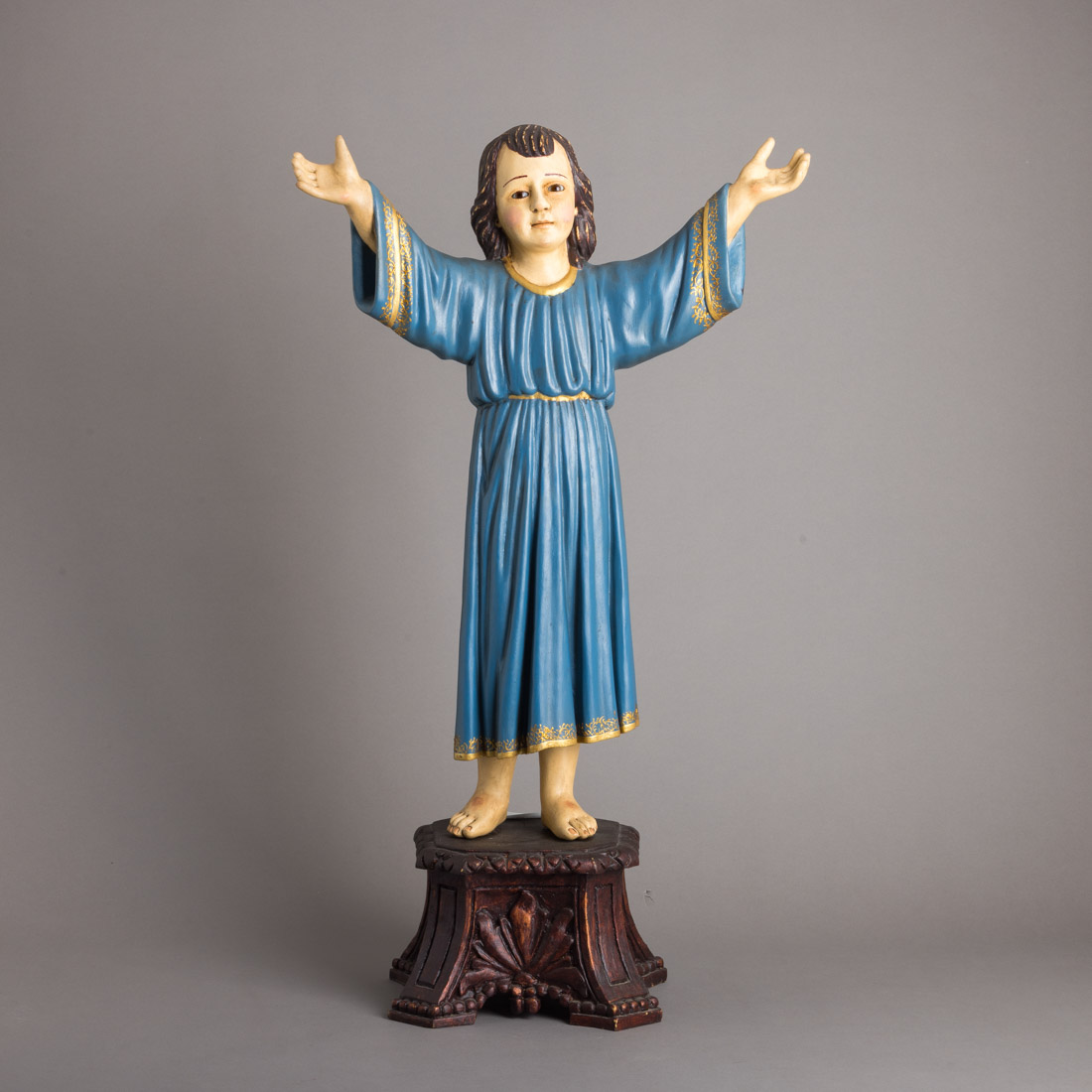 Escultura em madeira policromada, olhos de vidro, peanha em madeira entalhada. Pequenos defeitos.