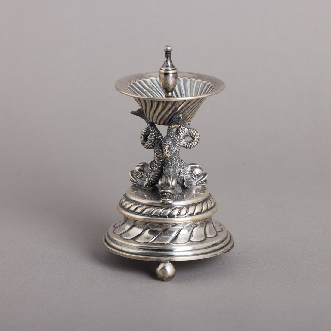 Em prata portuguesa contraste águia (pós 1985) de 835, decoração relevada. Sinais de uso, leve amolgadelas nos pés.