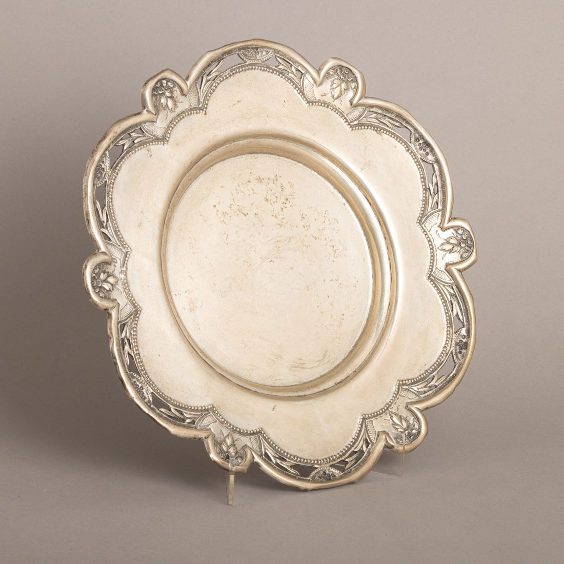 Em prata portuguesa contraste javali (1887-1937) de 833, aba relevada e vazada "flores". Amolgadelas.