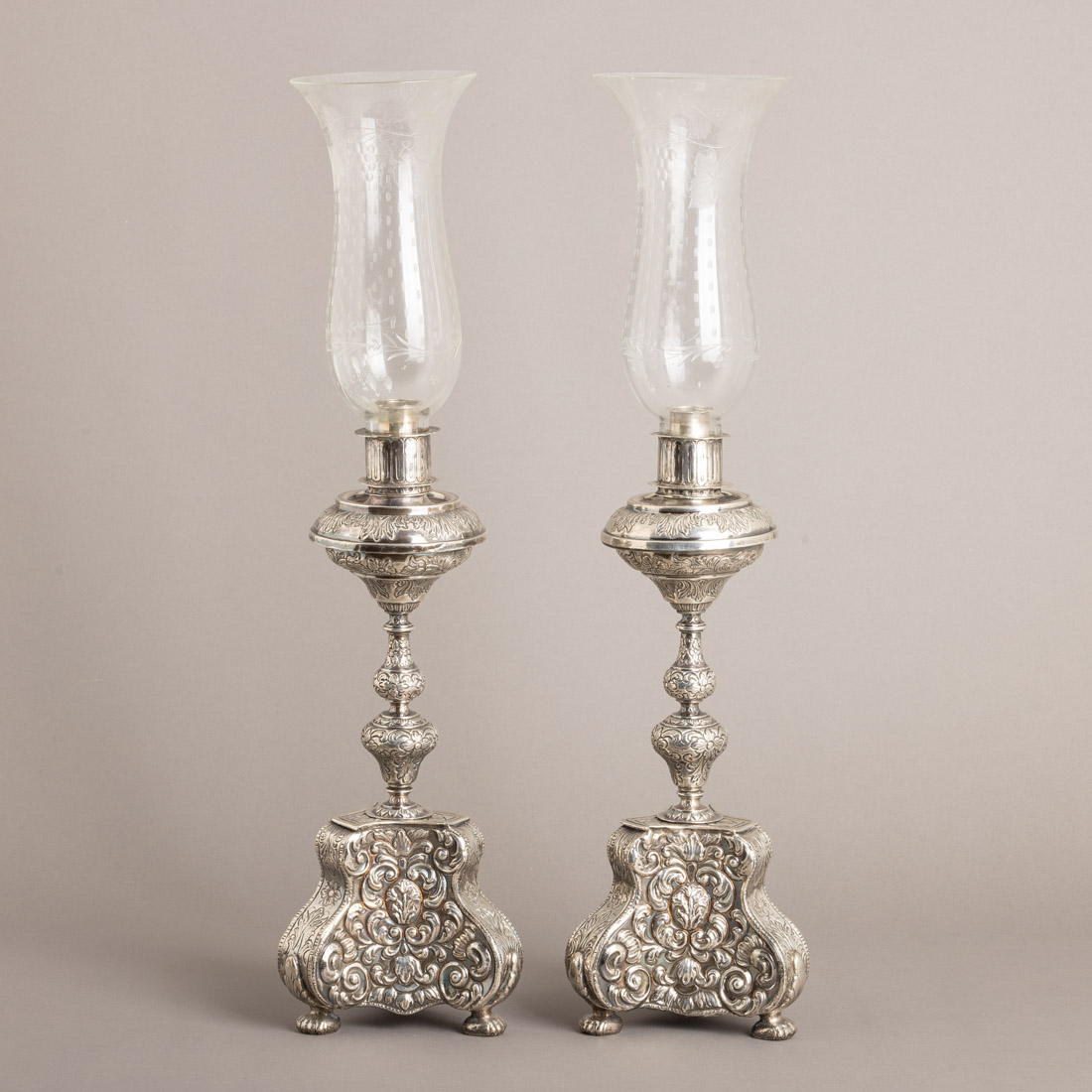 Em prata decoração relevada e gravada "elementos vegetalistas", verrines em vidro gravado. Sem marcas, ao abrigo do Decreto-Lei n.º 120/2017. Sinais de uso e pequenas amolgadelas.