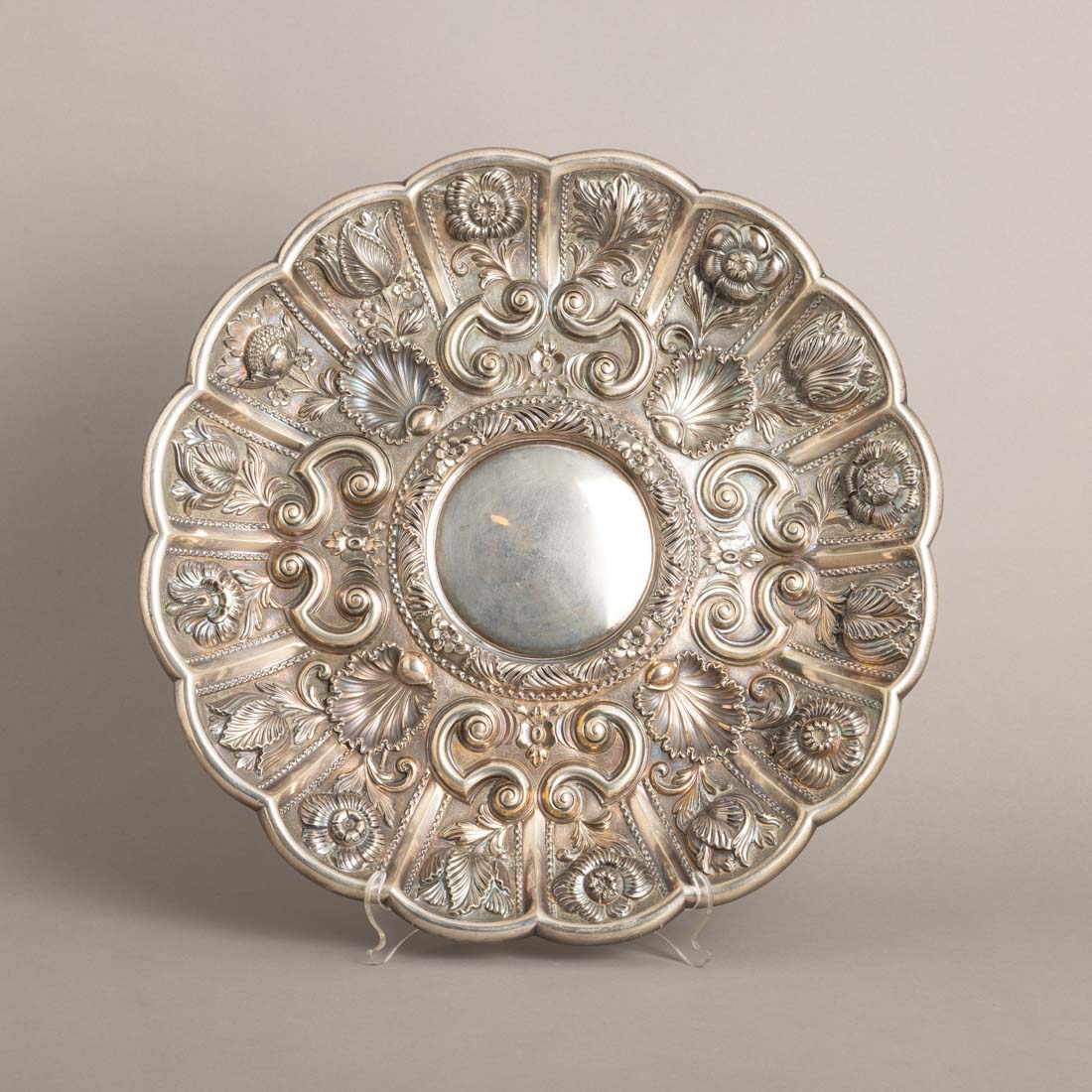 Em prata portuguesa contraste javali (1887-1937) de 833, decoração repuxada e cinzelada "flores, enrolamentos e concheados". Sinais de uso