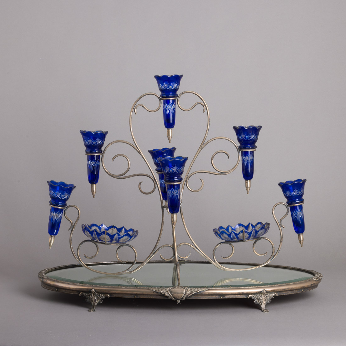 Moldura e armação em prata portuguesa contraste javali (1887-1937) de 833, decoração relevada, floreiras em cristal bicolor, plateau oval com espelho. Taças e 2 floreiras com pequenas esbeiçadelas e outra com defeito, pequenas amolgadelas e haste partida.Dim.: 42; 60x41 cm.