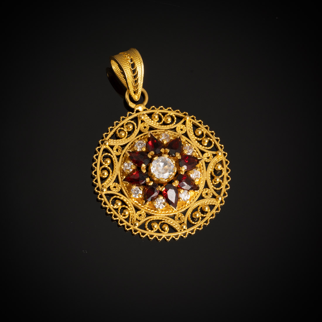 Em ouro e filigrana de ouro português de 19,2Kt., contraste veado (pós 1985), cravejado com granadas e zircónias. Sinais de uso.