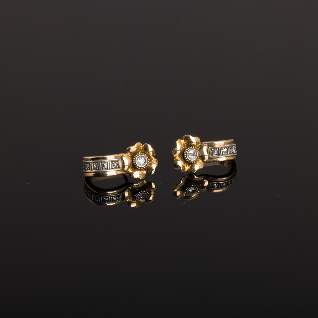 Em ouro e prata marcas não identificadas, cravejado com diamantes em talhe de brilhante e rosa. Sem contrastes portugueses, ao abrigo do Decreto-Lei n.º 120/2017. Sinais de uso.