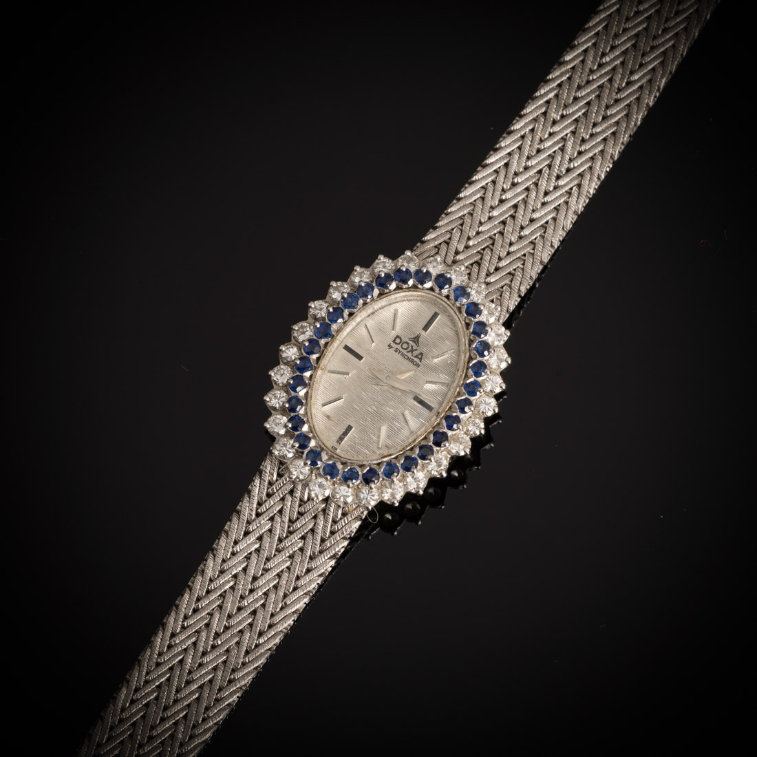 Suíço. Caixa e bracelete em ouro branco de 18Kt., cravejado com diamantes e safiras. Movimento mecânico de corda. Em marcha. Sinais de uso.
