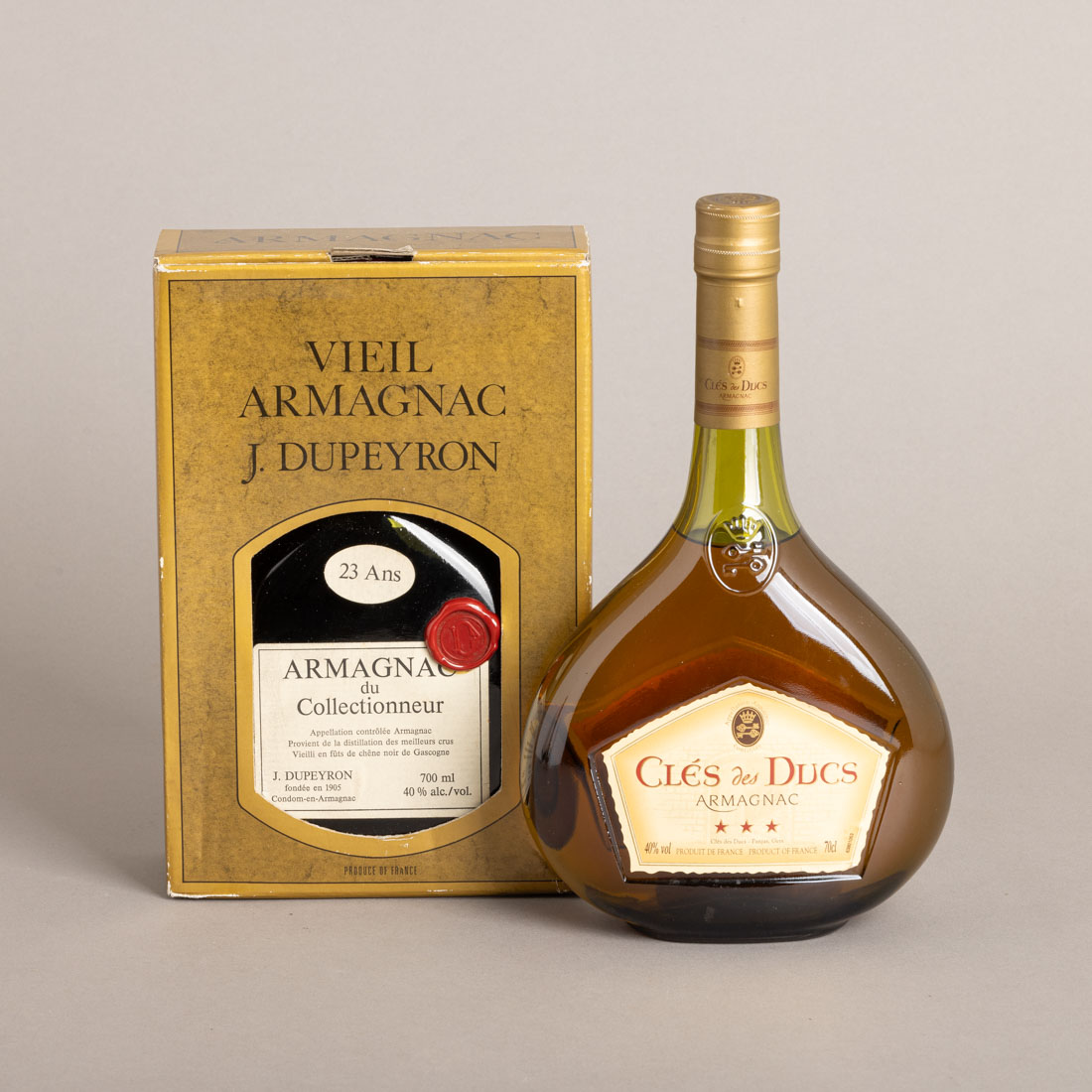 418. COGNAC ARMAGNAC CLÉS DES DUCS 3 STARS E J. DUPEYRON DU COLLECTIONNEUR 23 ANOS