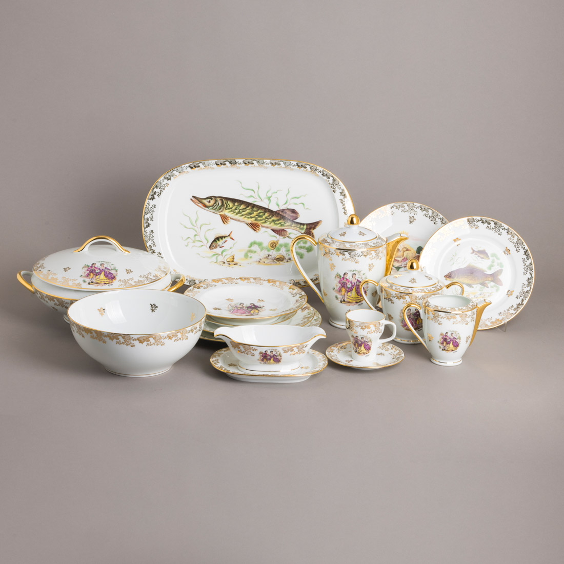 Em porcelana francesa de Limoges, decoração policromada e dourada "cena galante", "aves" e "peixes". Composto por 35 pratos rasos, 12 fundos, 10 de sobremesa, 1 saladeiras, 7 travessas, terrina, molheira, cafeteira, leiteira, açucareiro, 11 chávenas e 10pires. 1 prato raso, 2 de sobremesa, 1 travessa e 1 pires com esbeiçadelas, 1 fundo e uma chávena com cabelo.