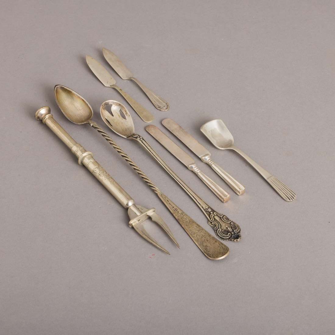Em prata portuguesa contraste javali (1887-1937) e águia (1938-1984) de 833, decoração diversa. Acompanha duas facas de manteiga em metal prateado. Sinais de uso.