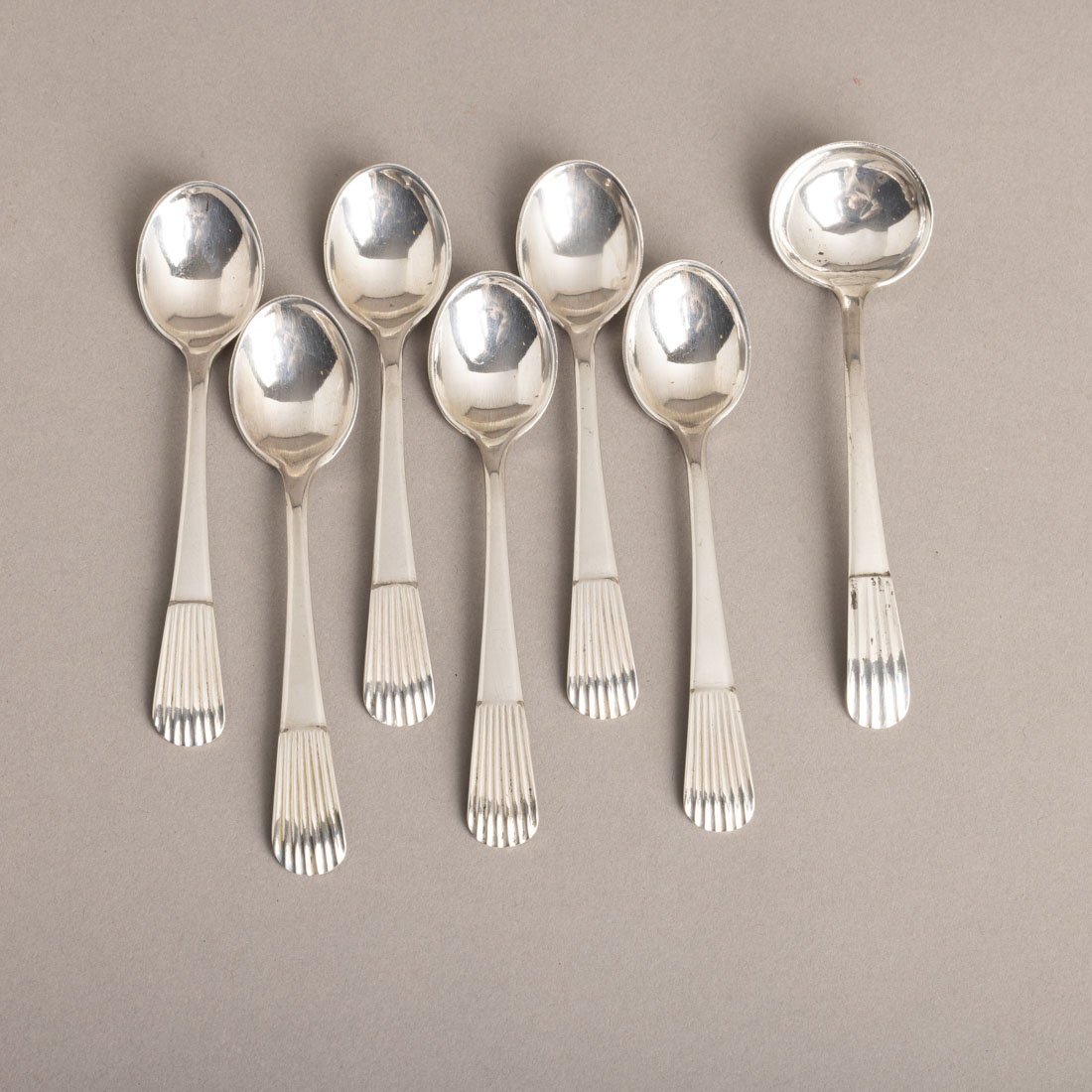 460. CONJUNTO DE SEIS COLHERES DE CHÁ E CONCHA DE AÇÚCAR