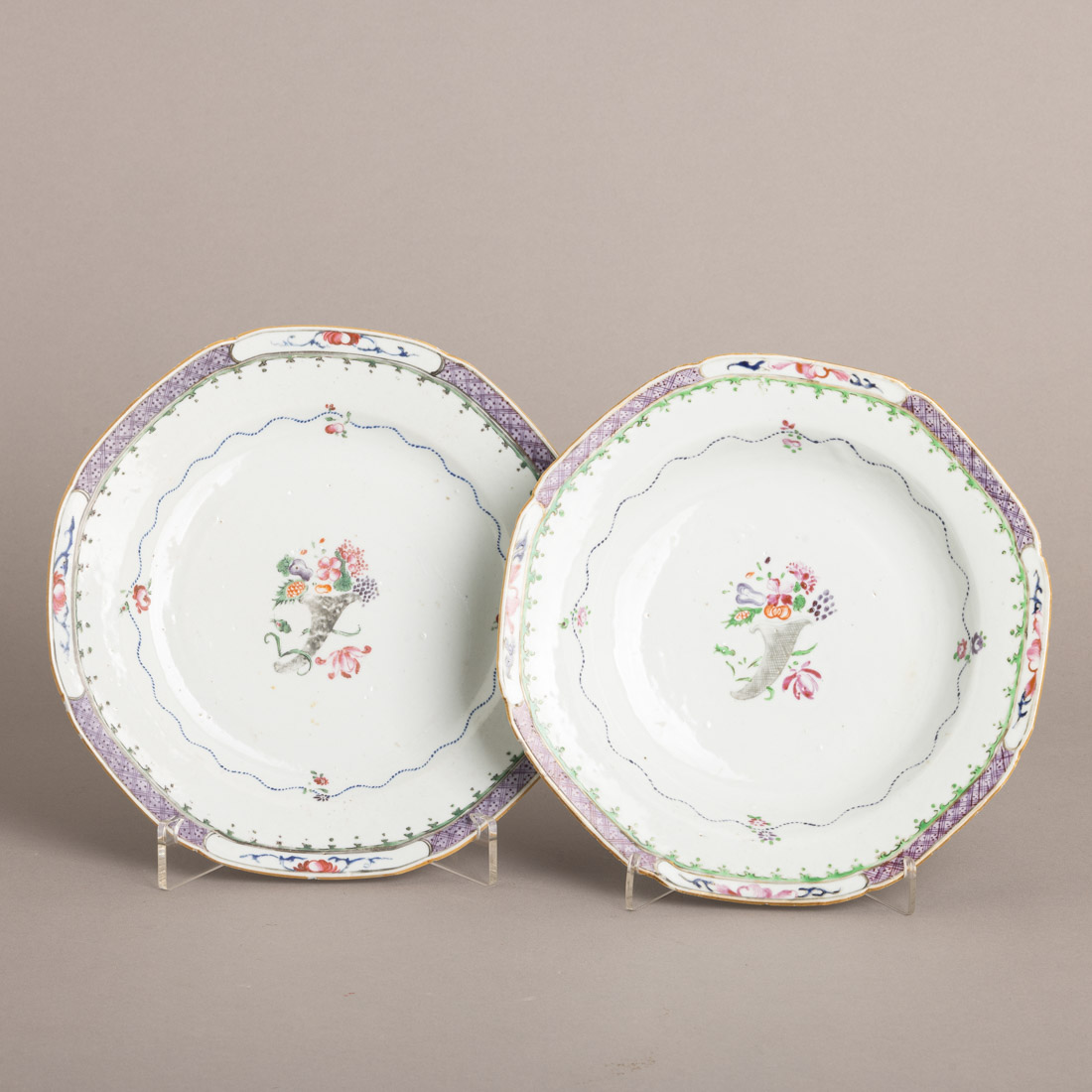 Em porcelana da China, Companhia das Índias, Séc. XVIII, decoração policromada com esmaltes da família rosa "Cornucópia com flores". Ligeiro desgaste e pequenas esbeiçadelas.