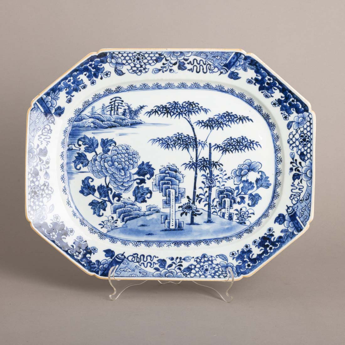 Em porcelana da China, Séc. XVIII, decoração a azul "Paisagem oriental, flores e bambus". Sinais de uso.