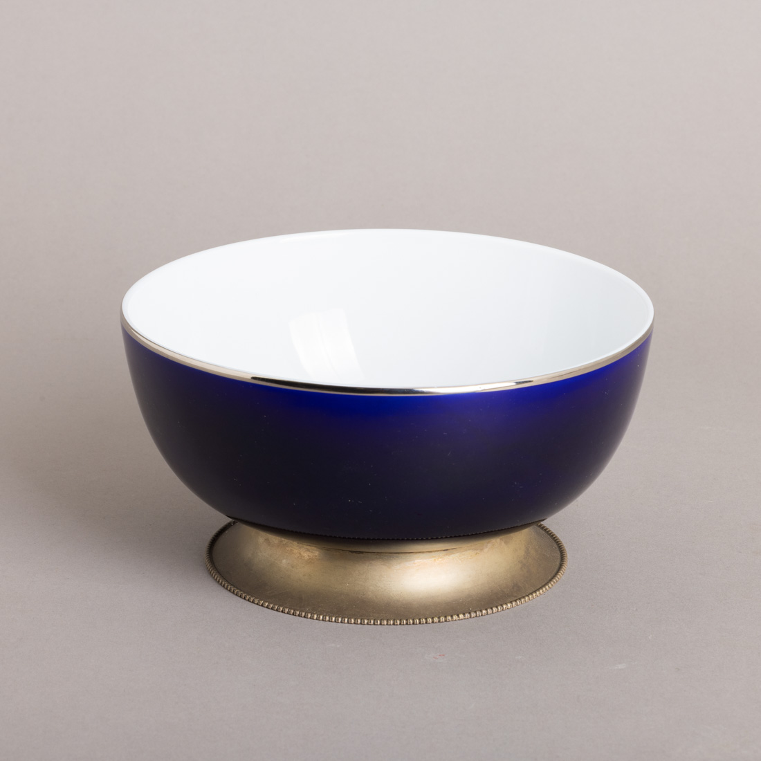 Em porcelana moldada, decoração a azul e prateado, base em prata portuguesa contraste águia (pós 1985) de 925, marcada. Sinais de uso.