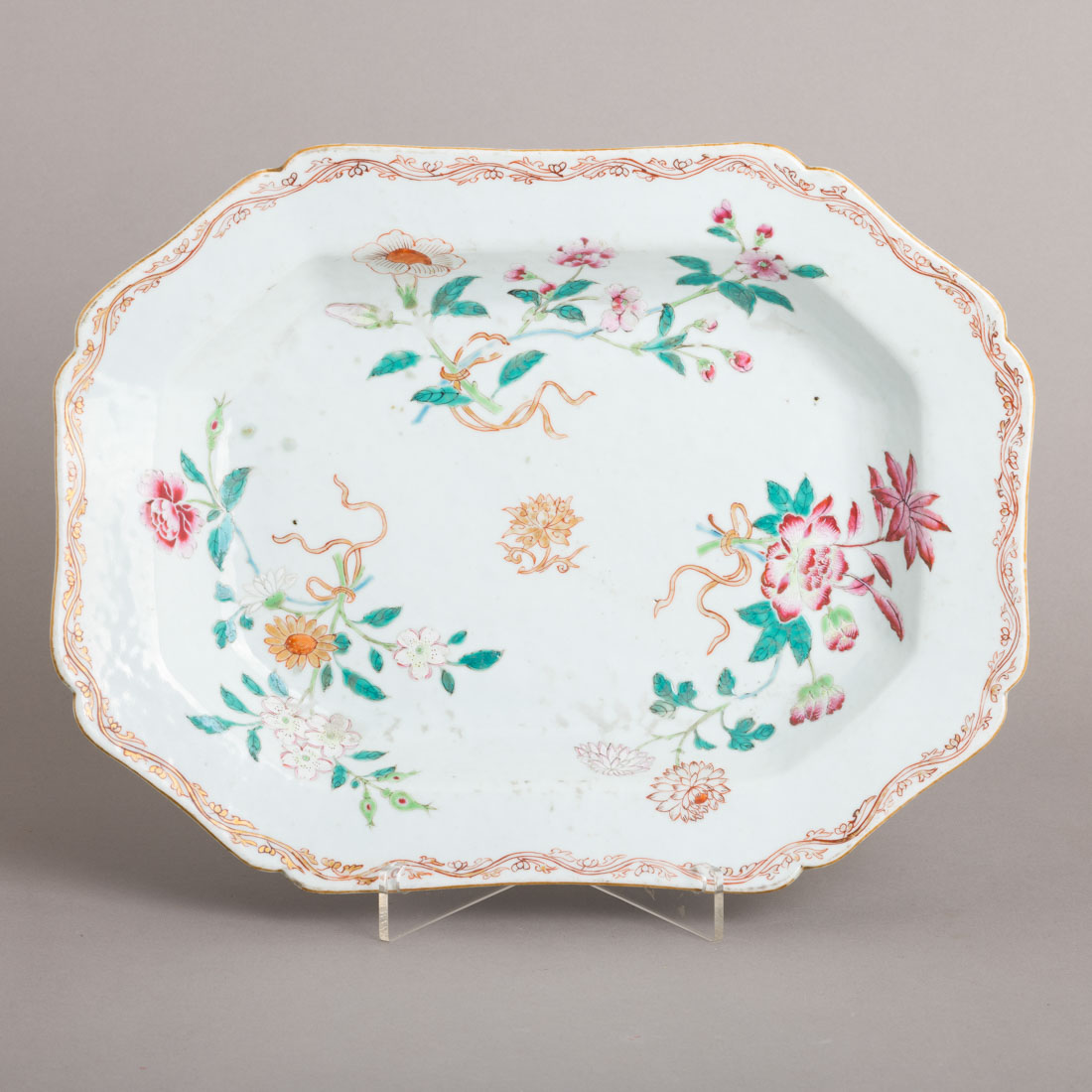 Em porcelana da China Companhia das Índias, Séc. XVIII, decoração policromada e dourada com esmaltes da família rosa "flores". Sinais de uso e desgaste.