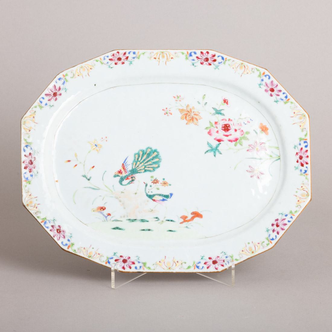 Em porcelana da China Companhia das Índias, Séc. XVIII, decoração policromada e dourada com esmaltes da família rosa "pavões". Sinais de uso e desgaste.