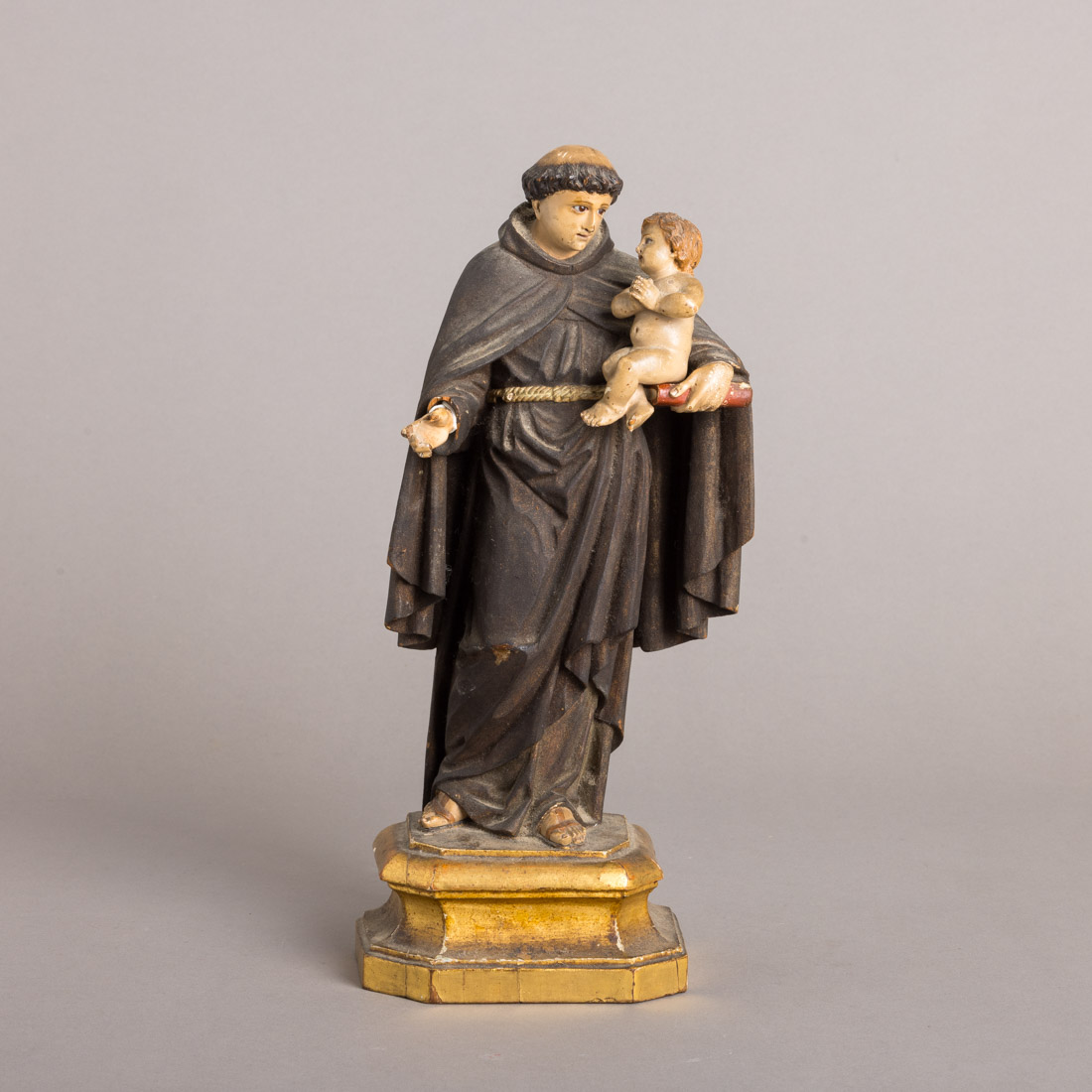 Escultura em madeira policromada, olhos de vidro, peanha dourada. Séc. XIX/XX. Faltam dedos, pequenas falhas e defeitos, menino com vestígios de xilófagos.