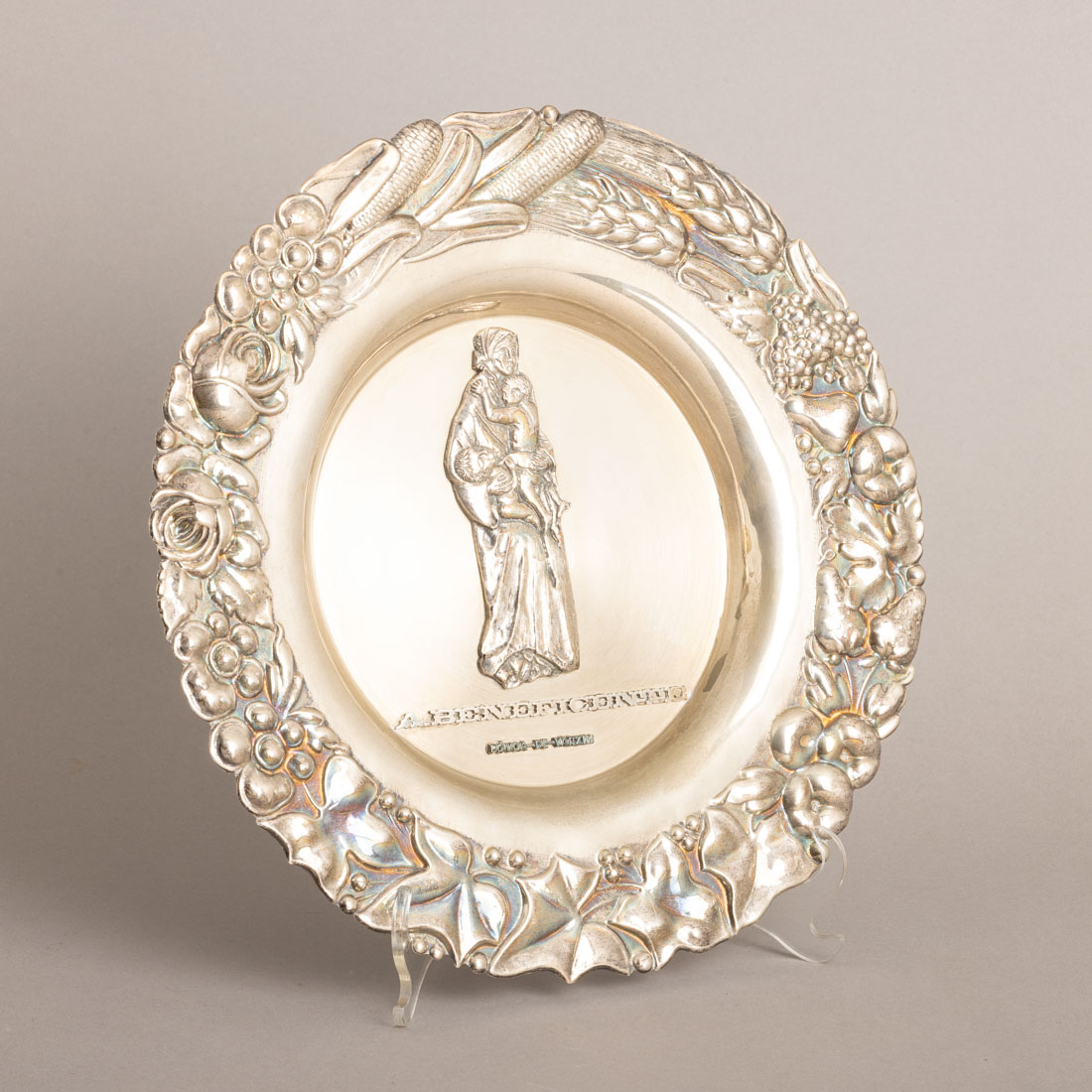 Em prata portuguesa contraste águia (pós 1985) de 835, aba relevada decorada com elementos vegetalistas, aplicações figura "Caridade" e "A Beneficente - Povoa de Varzim", no verso dedicatória gravada. Sinais de uso.