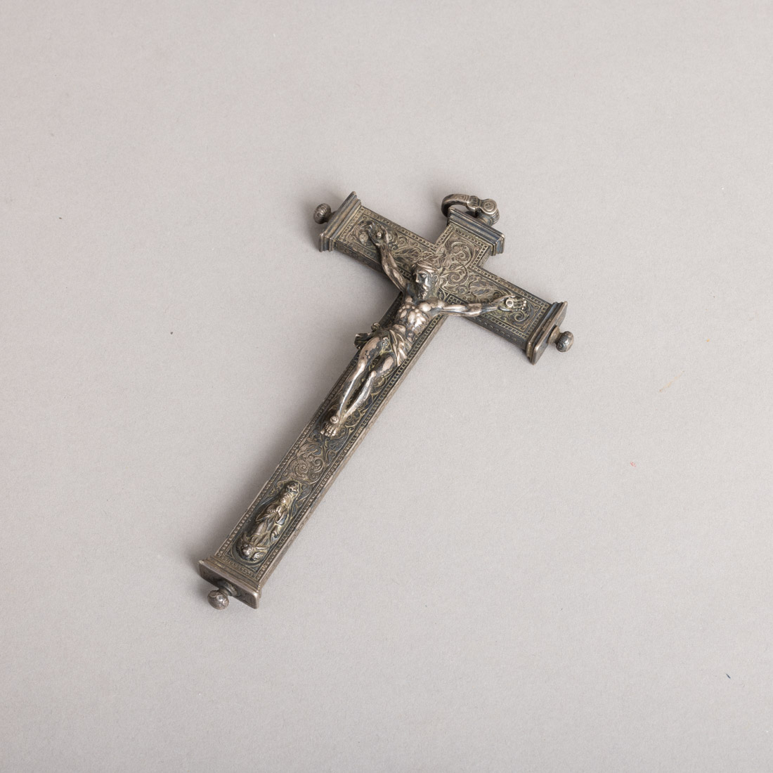 Em prata, decoração relevada e gravada com elementos vegetalistas, na base Nossa Senhora coroada. Sem marcas, ao abrigo do Decreto-Lei n.º 120/2017. Sinais de uso, pequena falha.