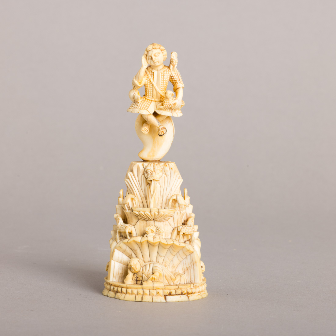 Escultura em marfim, base em socalcos "Santa Maria Madalena, fonte da Vida, aves e ovelhas". Indo-Portuguesa