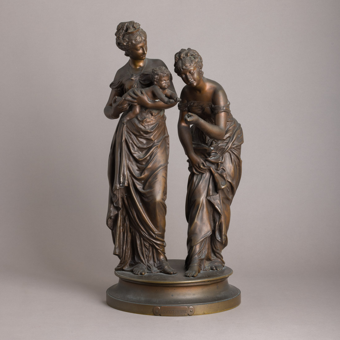 Grupo escultórico em bronze patinado, assinado. Francês. Pequenos defeitos.