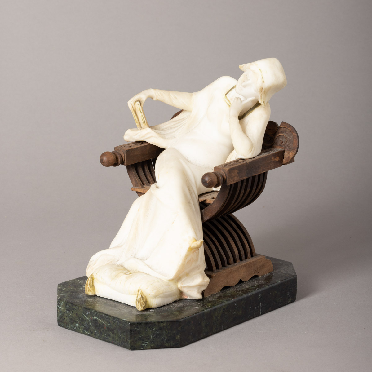Escultura em alabastro, cadeira em madeira, base em mármore. Sinais de uso, pequenas falhas, pé colado.