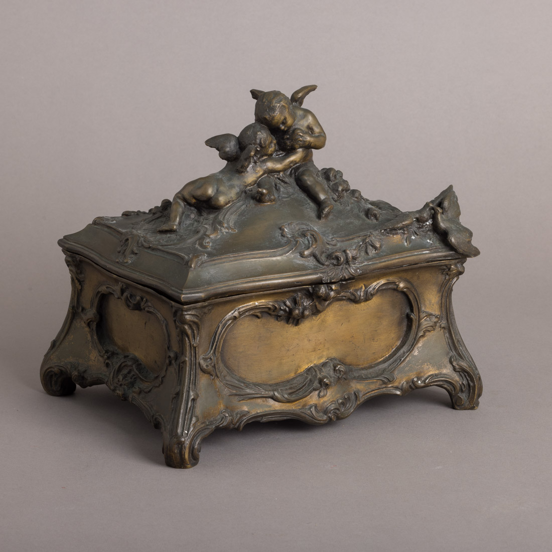 Em bronze patinado, decoração relevada com elementos vegetalistas, na tampa "cupidos e pombas", assinada. Sinais de uso.