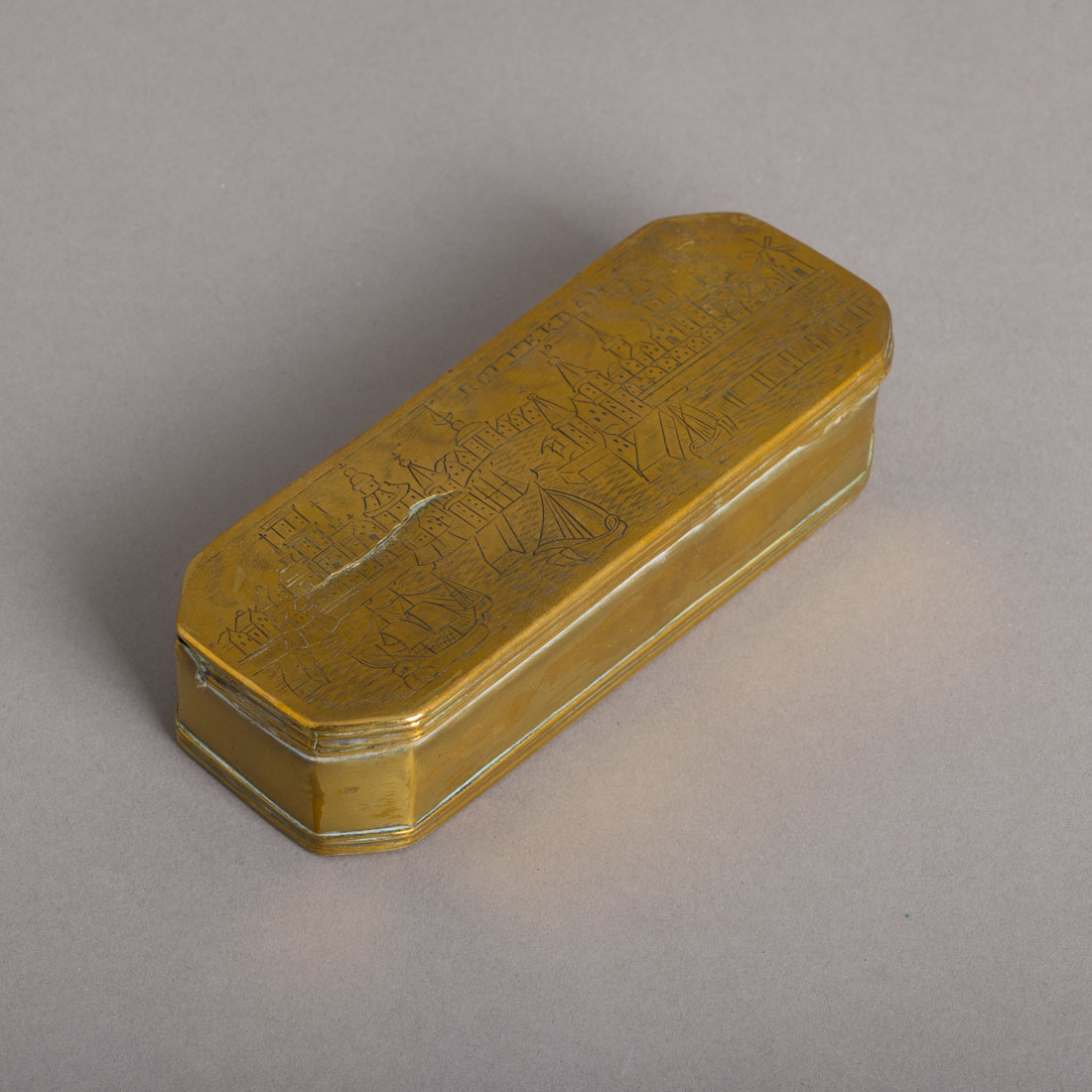 Em metal amarelo, decoração gravada "vista da cidade de Roterdão". Pequenas amolgadelas, falha e defeito na tampa.