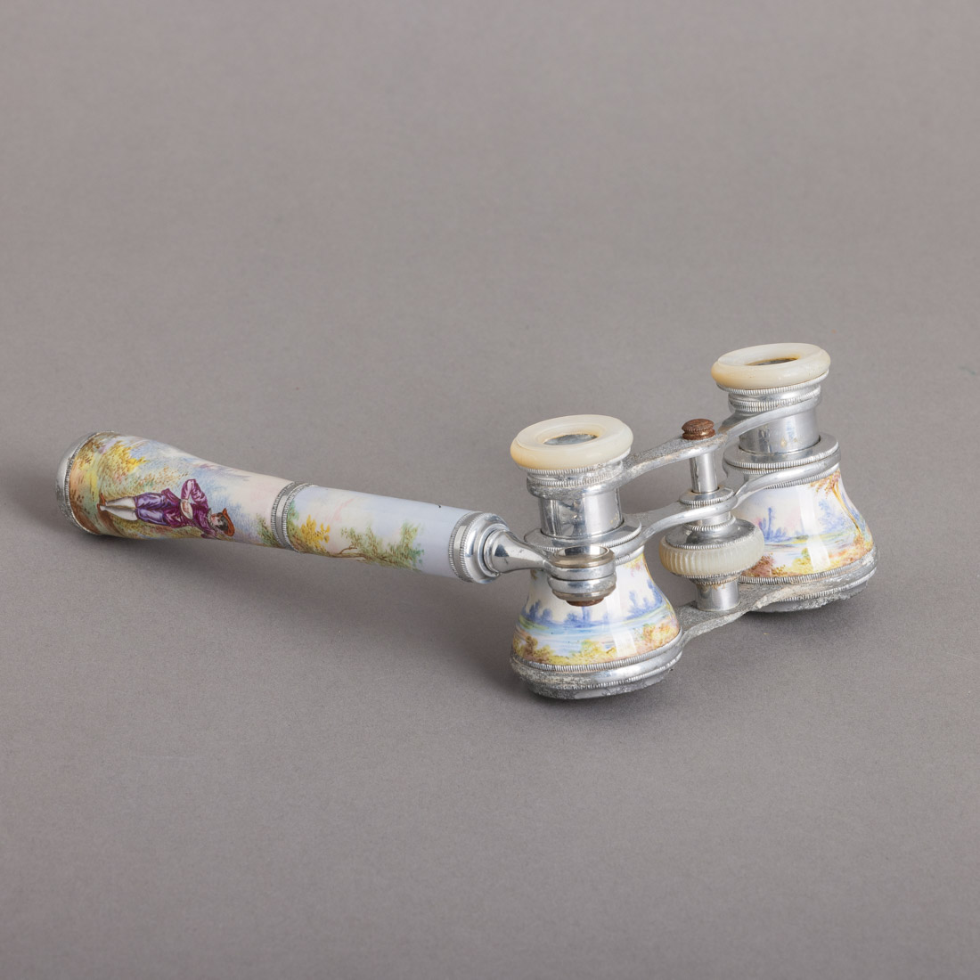 Em metal prateado, esmaltes policromado "paisagem com figuras" e madrepérola, marcado Joseph Godchaux Opticien. Séc. XIX/XX. Defeitos e falhas das oxidações.