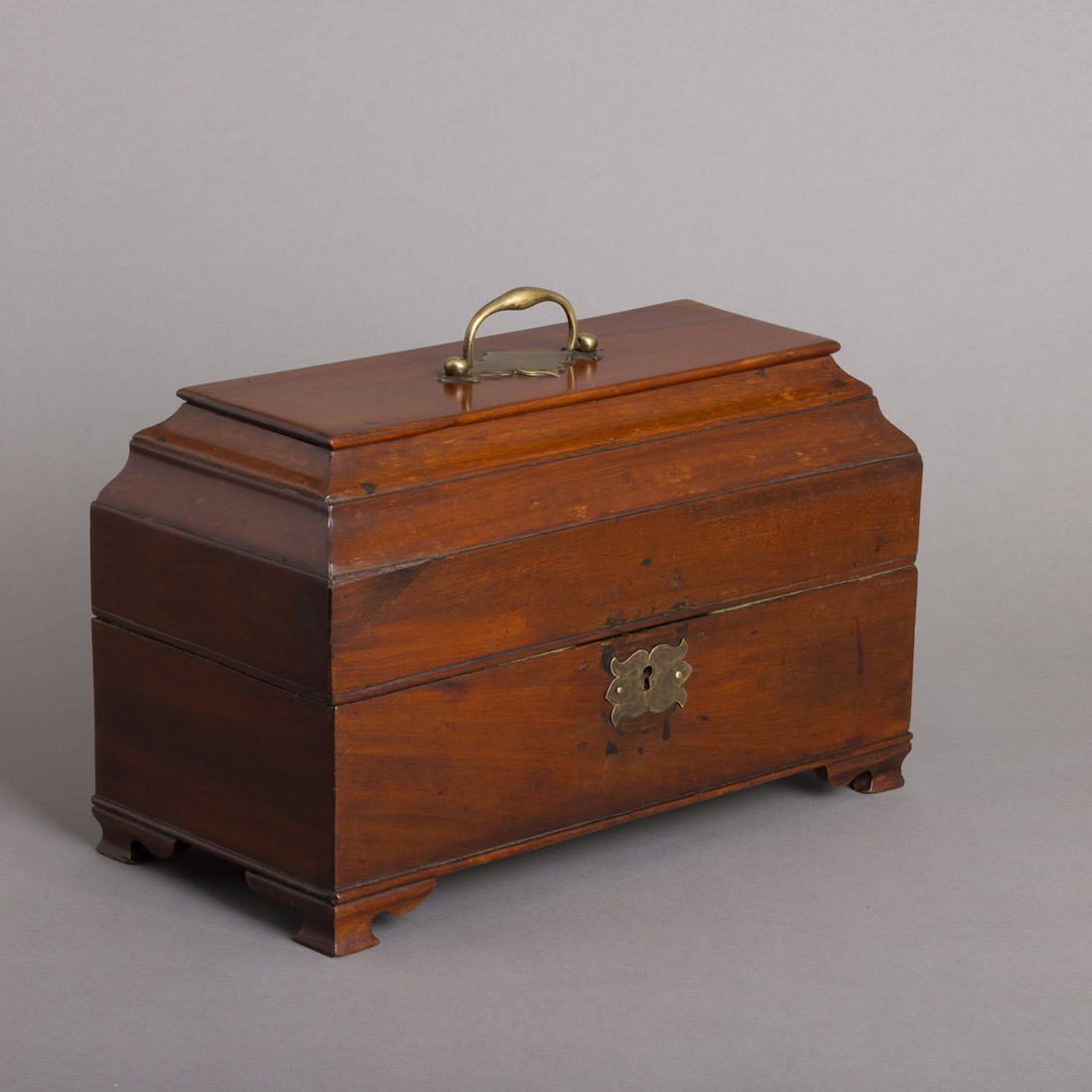 Em mogno, ferragens em metal amarelo, interior revestido a veludo verde. Inglesa. Sinais de uso e pequenas falhas.