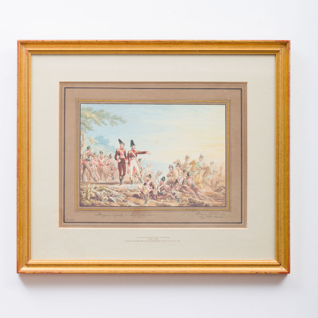 Aguarela sobre papel, representado soldados portugueses e espanhóis nas guerras Napoleónicas, assinada e datada J. Paul Fischer Fec. London 1814, possivelmente Johann Georg Paul Fischer (1786-1875), escola inglesa, Ínfimo defeito.