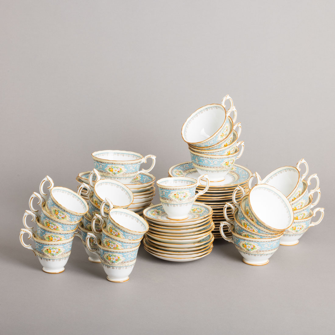 Em loiça pó de pedra inglesa, decoração policromada "flores, marcada Crown Staffordshire. Composto por treze chávenas de chá com catorze pires, doze de café com pires e vinte pratos para bolo. Sinais de uso.