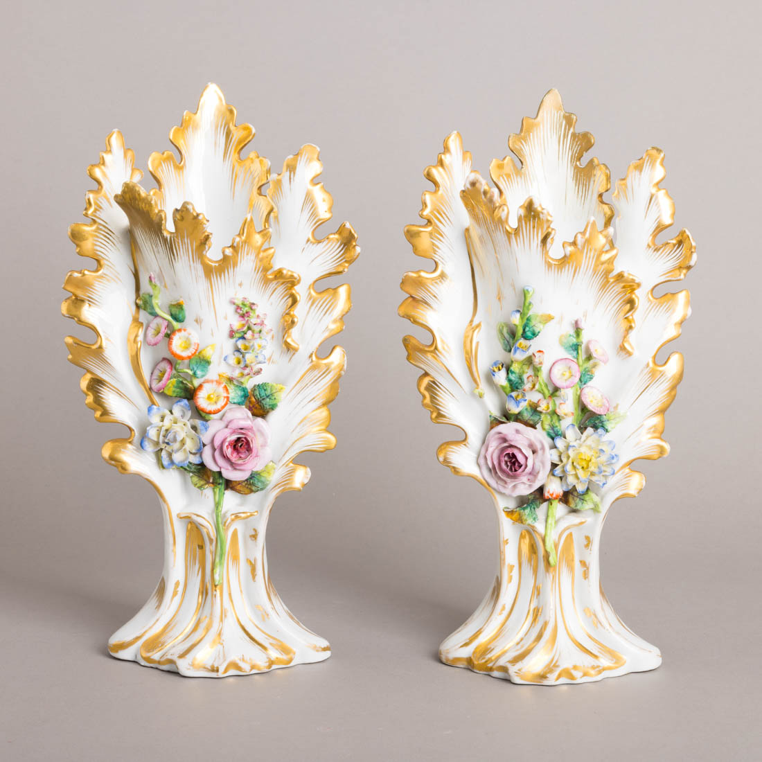 Em porcelana moldada e relevada, decoração policromada e dourada "flores". Europa, Séc. XIX. Desgaste no dourado, pequenas falhas nas flores e restauro na boca.