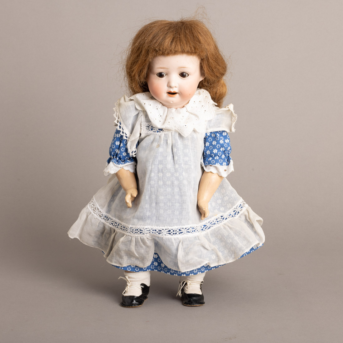 Cabeça em biscuit policromado, olhos de vidro oscilantes, corpo em papier maché, roupas não originais. Marcada Heubach Koppelsdorf 267.1. D.R.G.M. Germany. Sinais de uso e restauros.