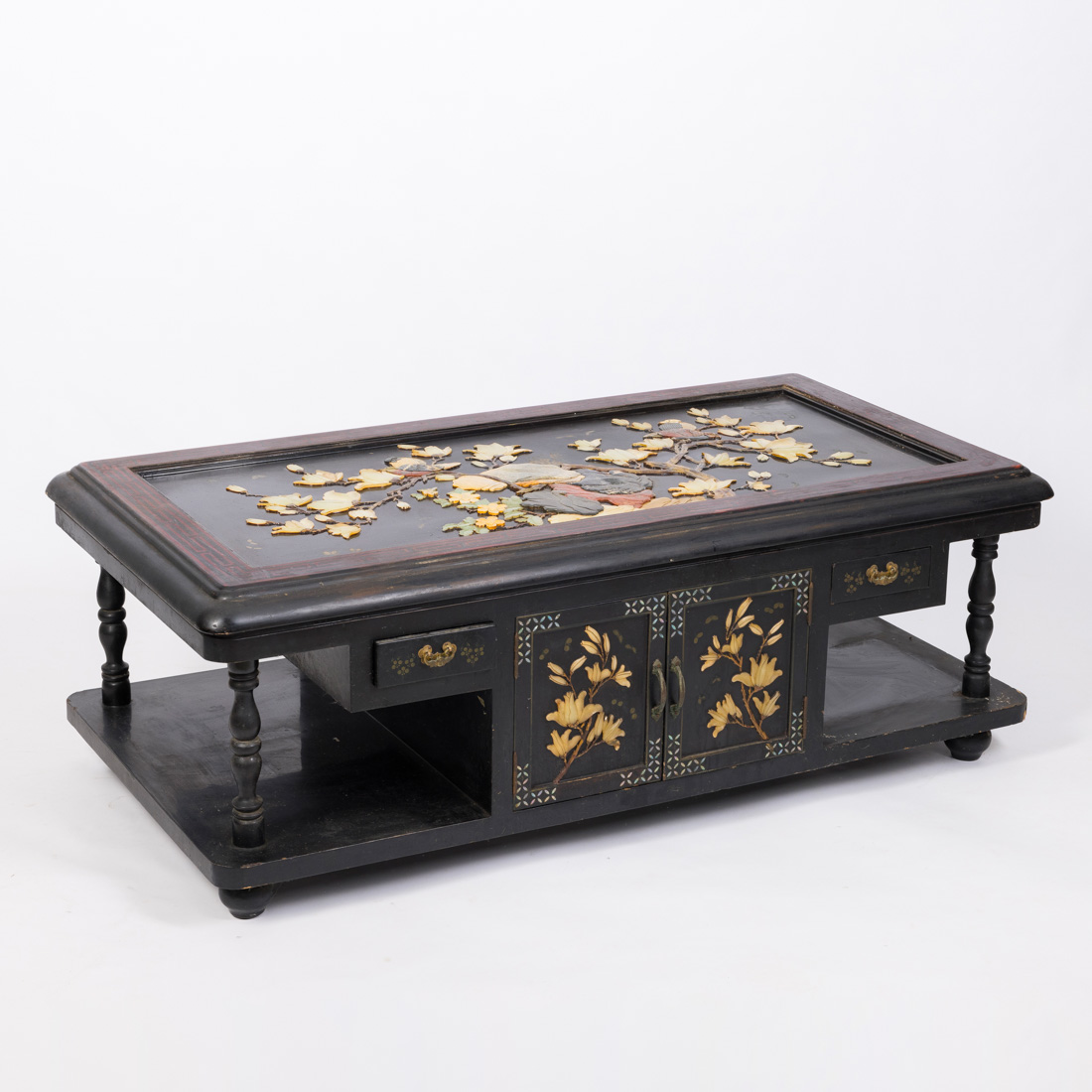 Em madeira lacada e pintada, aplicações de pedra dura "flores e pássaros", pequenas portas e gavetas. Pequenas falhas e defeitos.