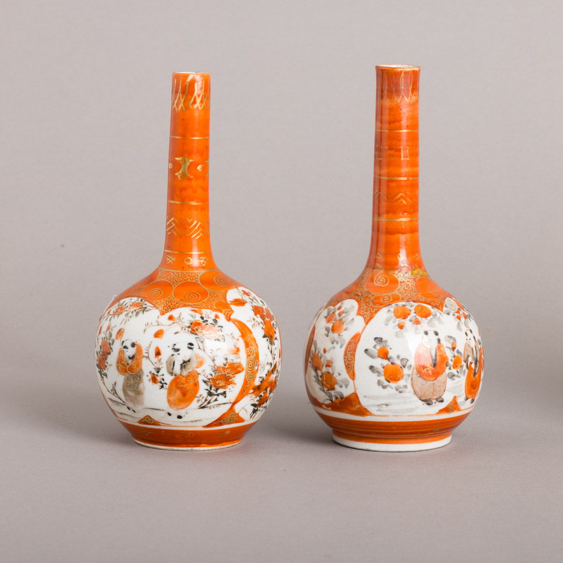 Em porcelana japonesa, decoração policromada e dourada "flores e figuras". Marcadas. Sinais de uso, uma colada e falha.