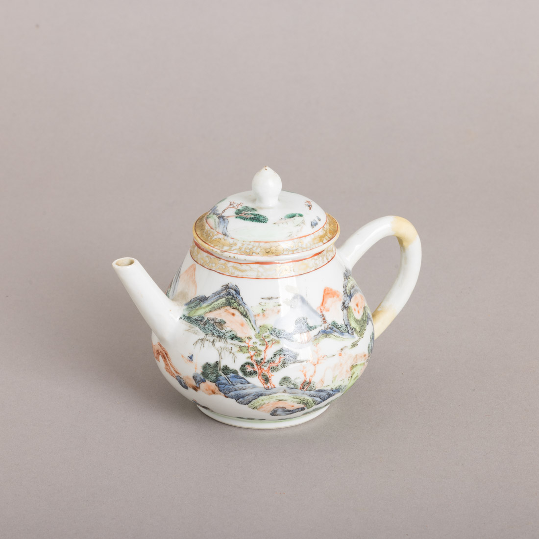 Em porcelana da China, Séc. XVIII, decoração com esmaltes policromos da família verde e dourado "paisagem montanhosa com casario e figuras" Desgaste, restauro na pega e na tampa.