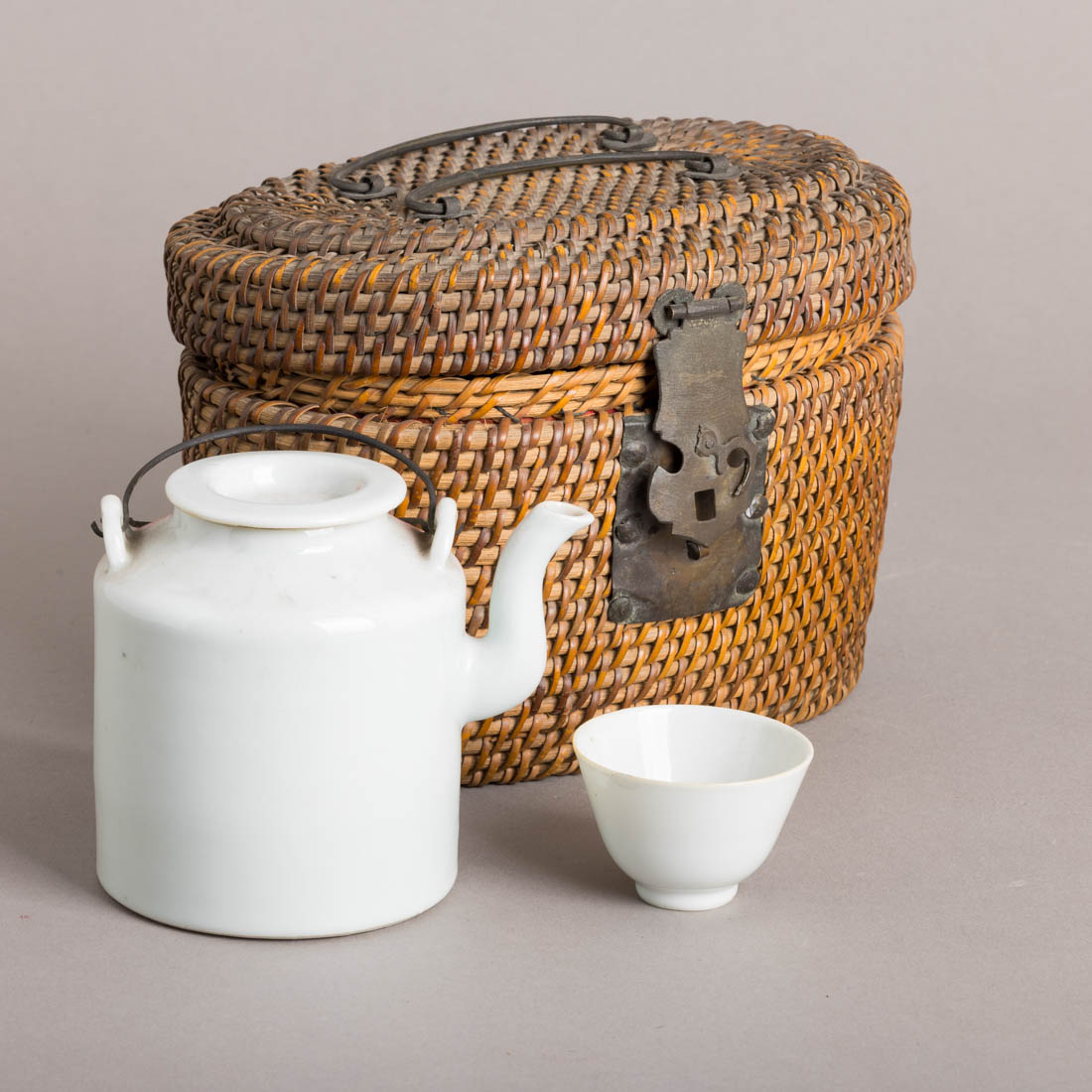 Em porcelana da China, decoração monocroma a branco. Em estojo de verga. Sinais de uso, taça com pequeno defeito.