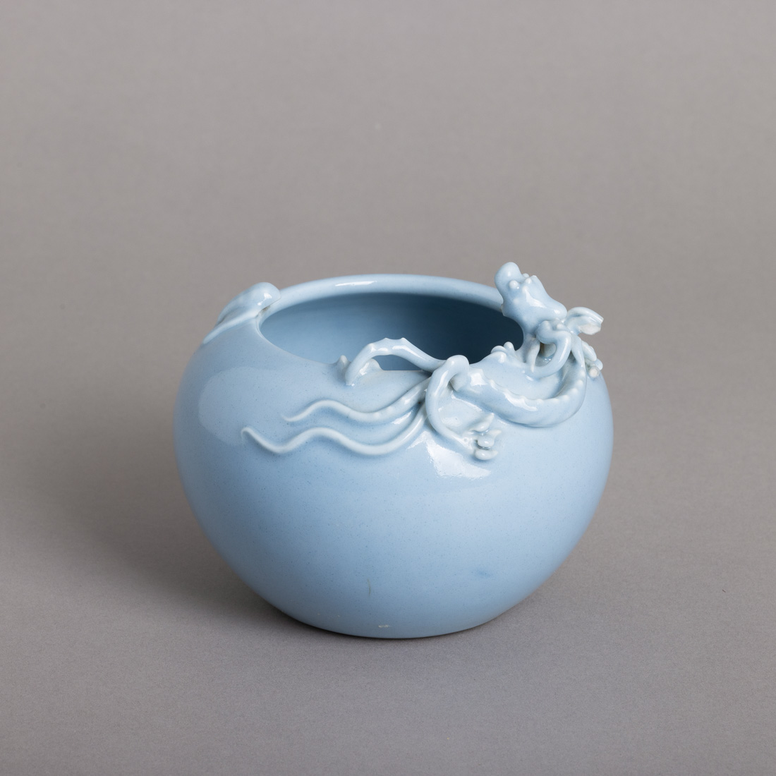 Em porcelana da China, decoração monocroma a azul com dragão e morcego. Marcado. Sinais de uso, falhas no dragão.