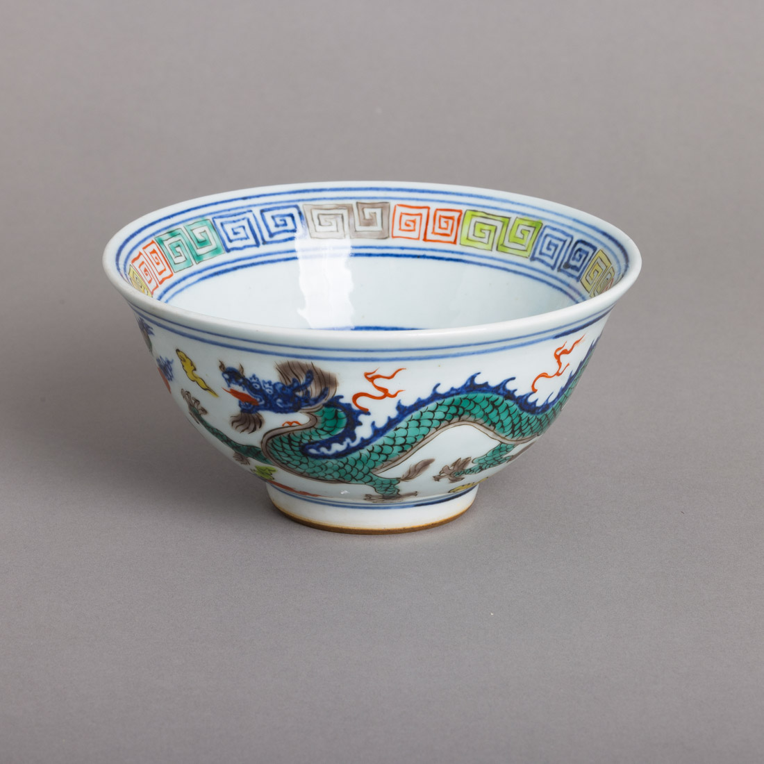Em porcelana da China, decoração policromada "dragões". Marcada. Sinais de uso.